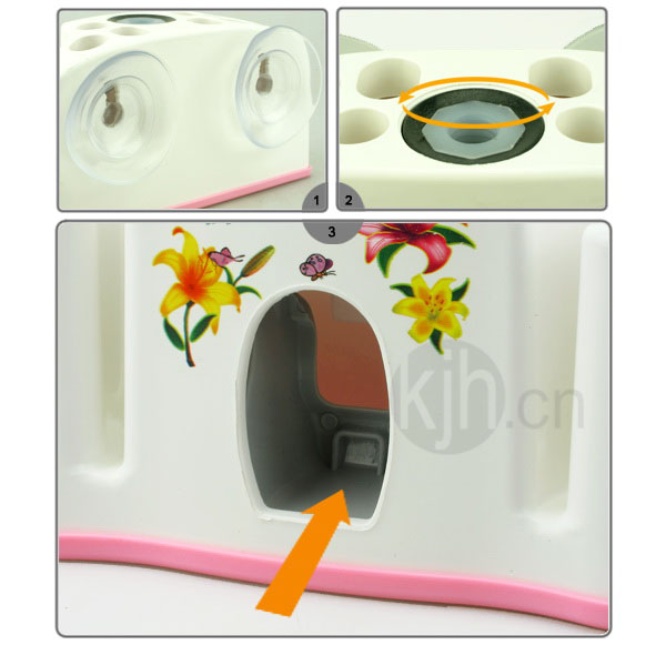 1.產(chǎn)品背部附強力吸盤,可固定在玻璃或光滑表面,更省空間。