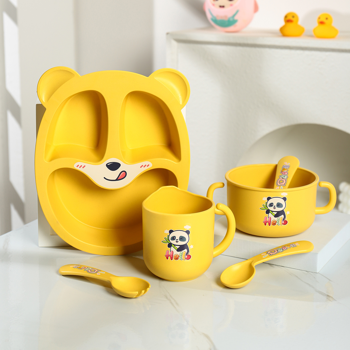 Size: 餐盤:245*200*45mm 碗:160*113*65mm/500ml 杯:110*83*93mm/350ml 勺叉:125mm