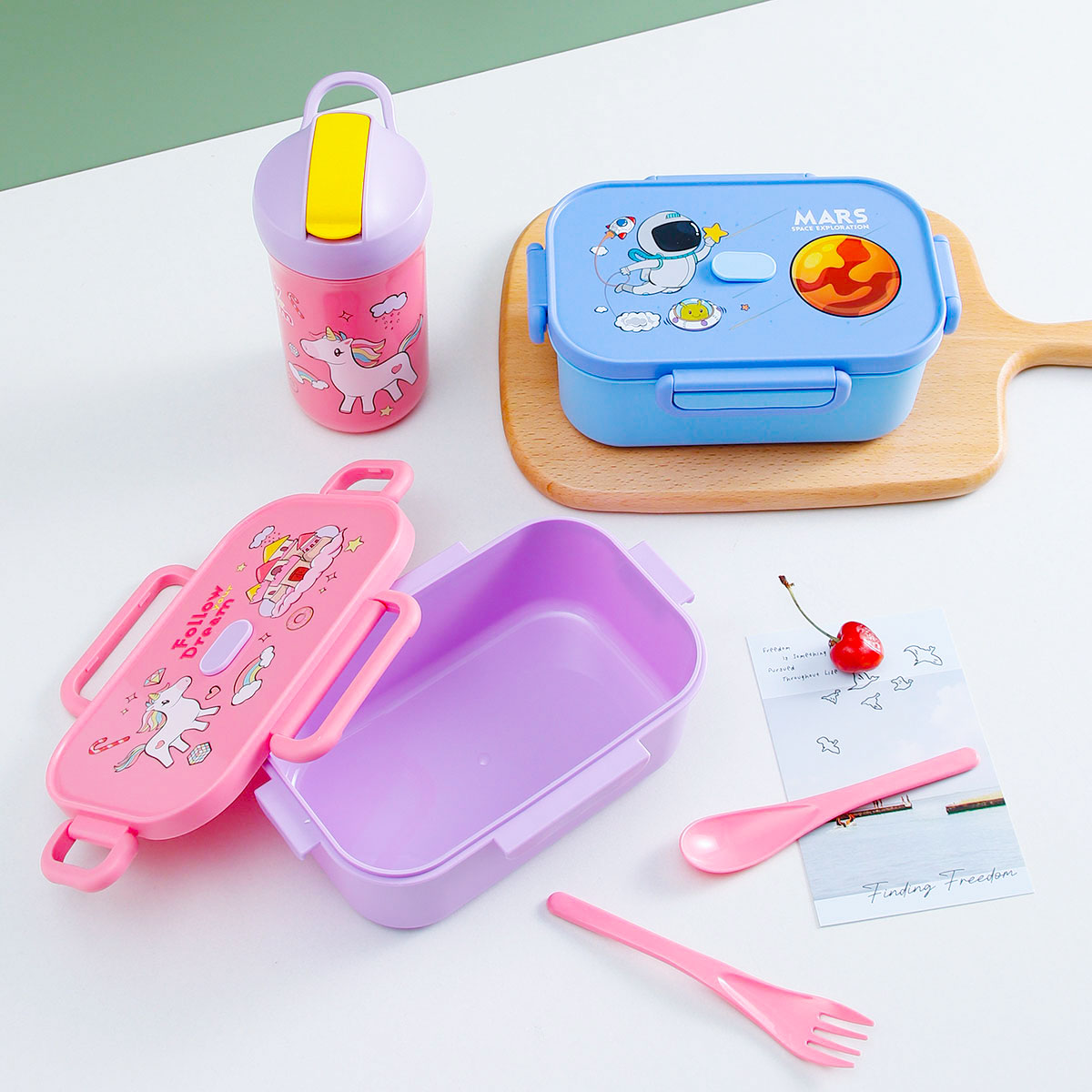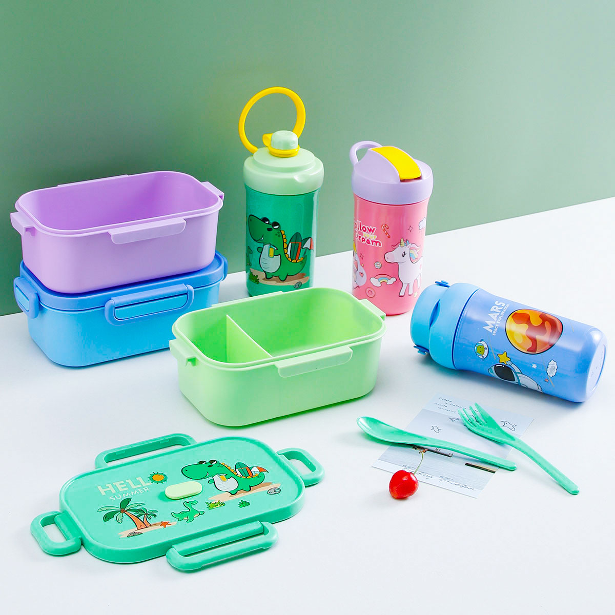 卡通長方單層/單層分格飯盒+翻蓋吸嘴/旋蓋運(yùn)動(dòng)/翻蓋運(yùn)動(dòng)水壺