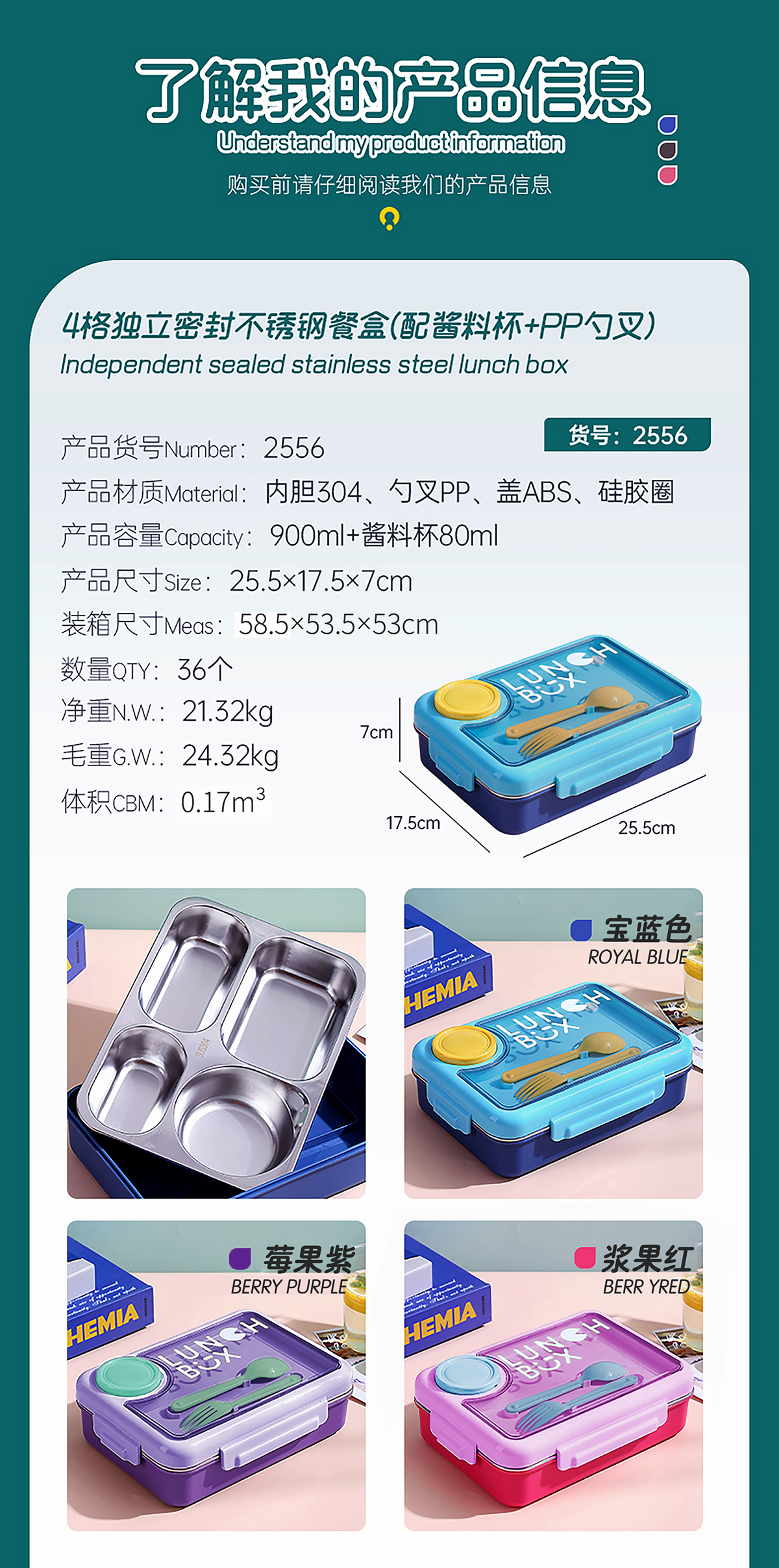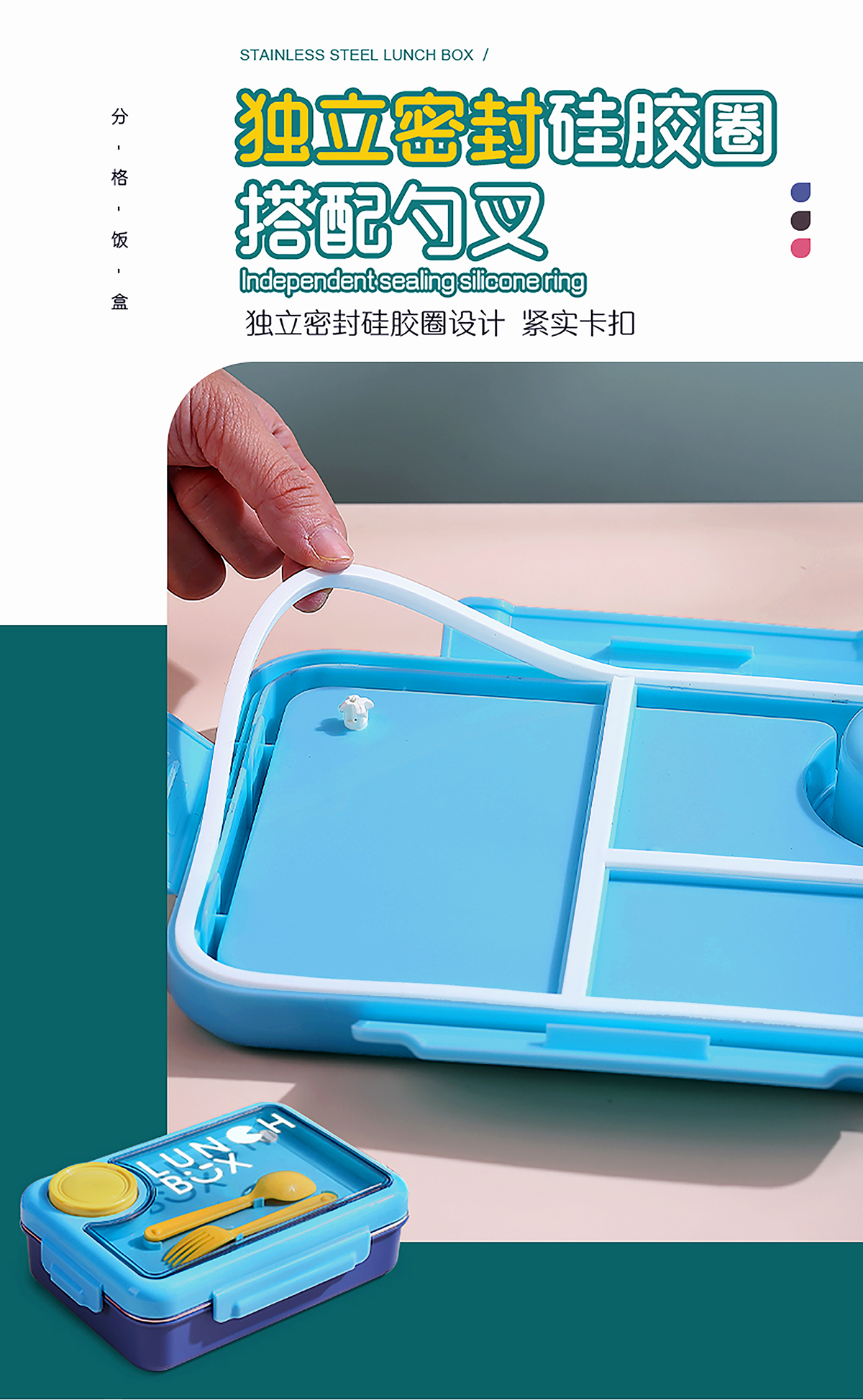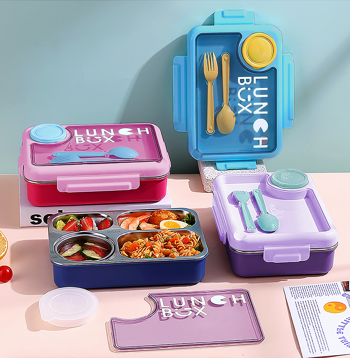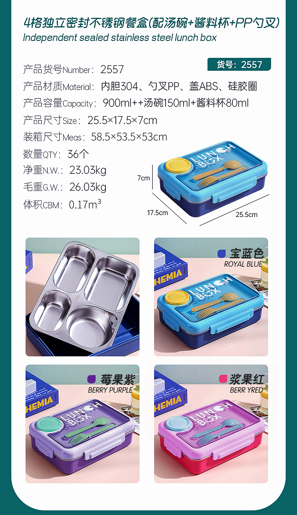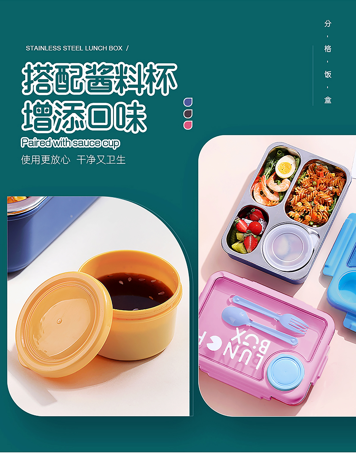 900ml獨(dú)立密封不銹鋼餐盒4格+醬料杯80ml+PP勺叉/帶湯碗150ml
