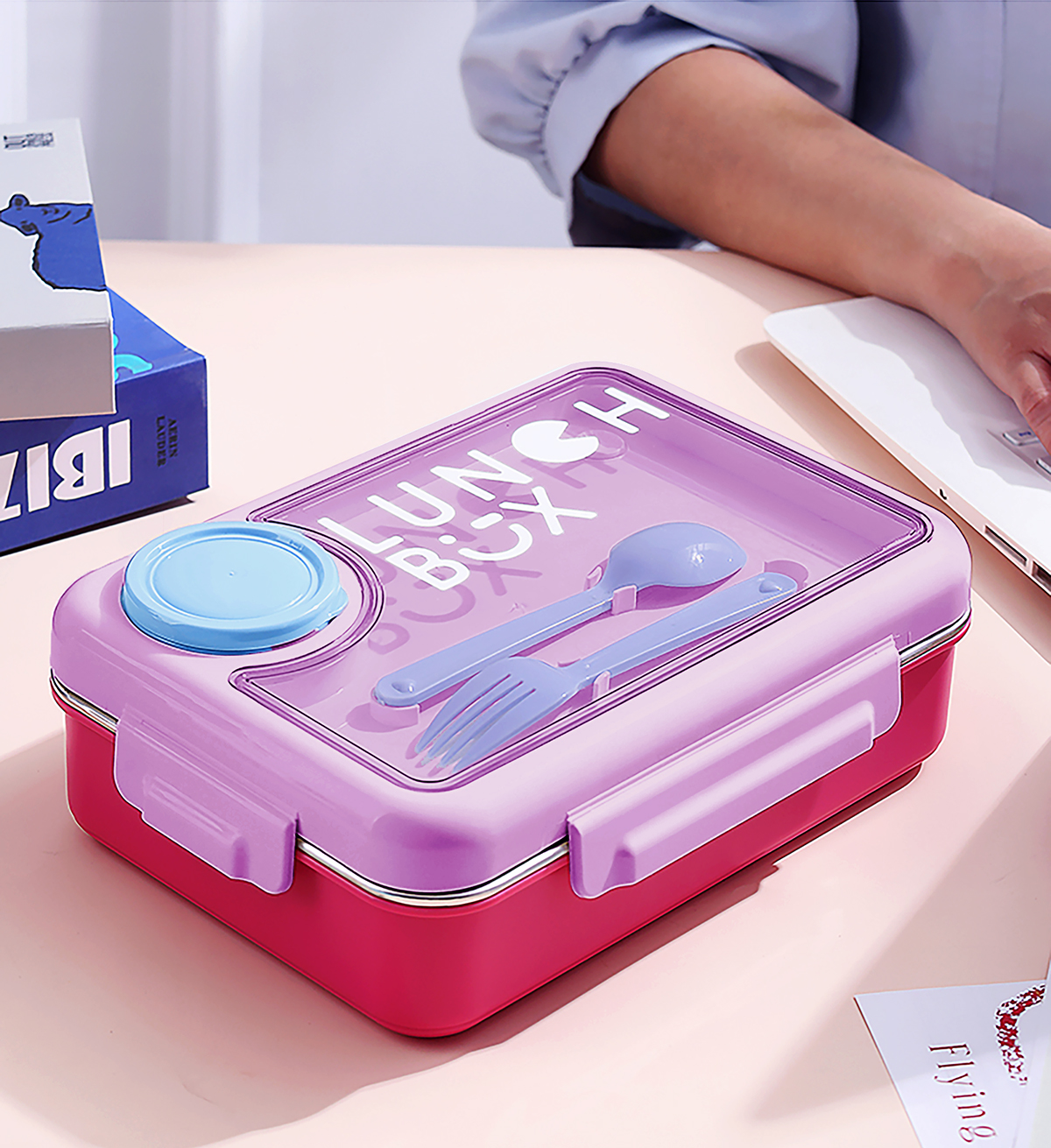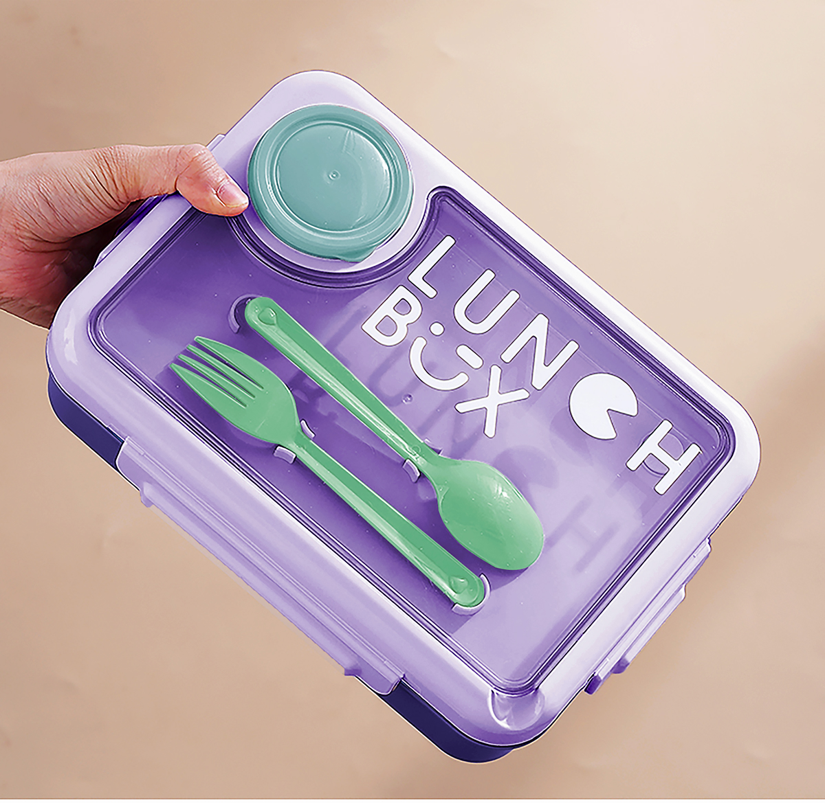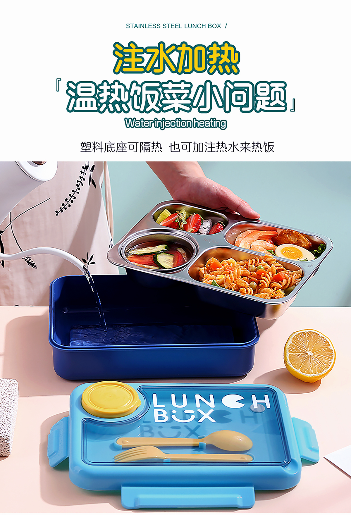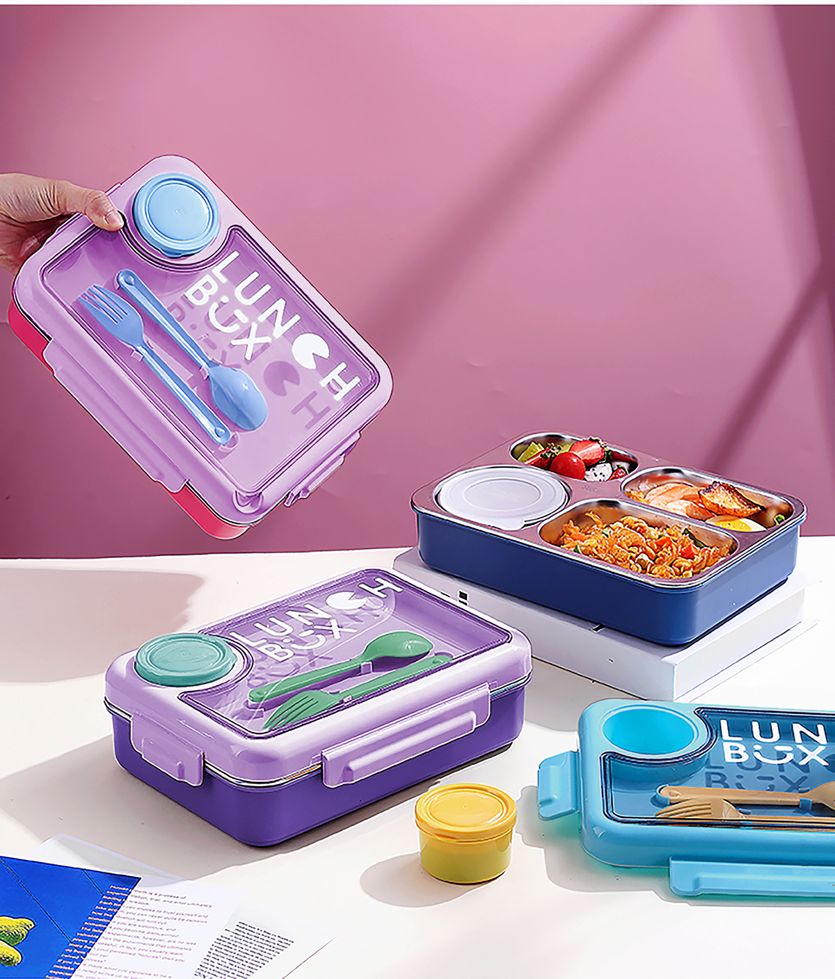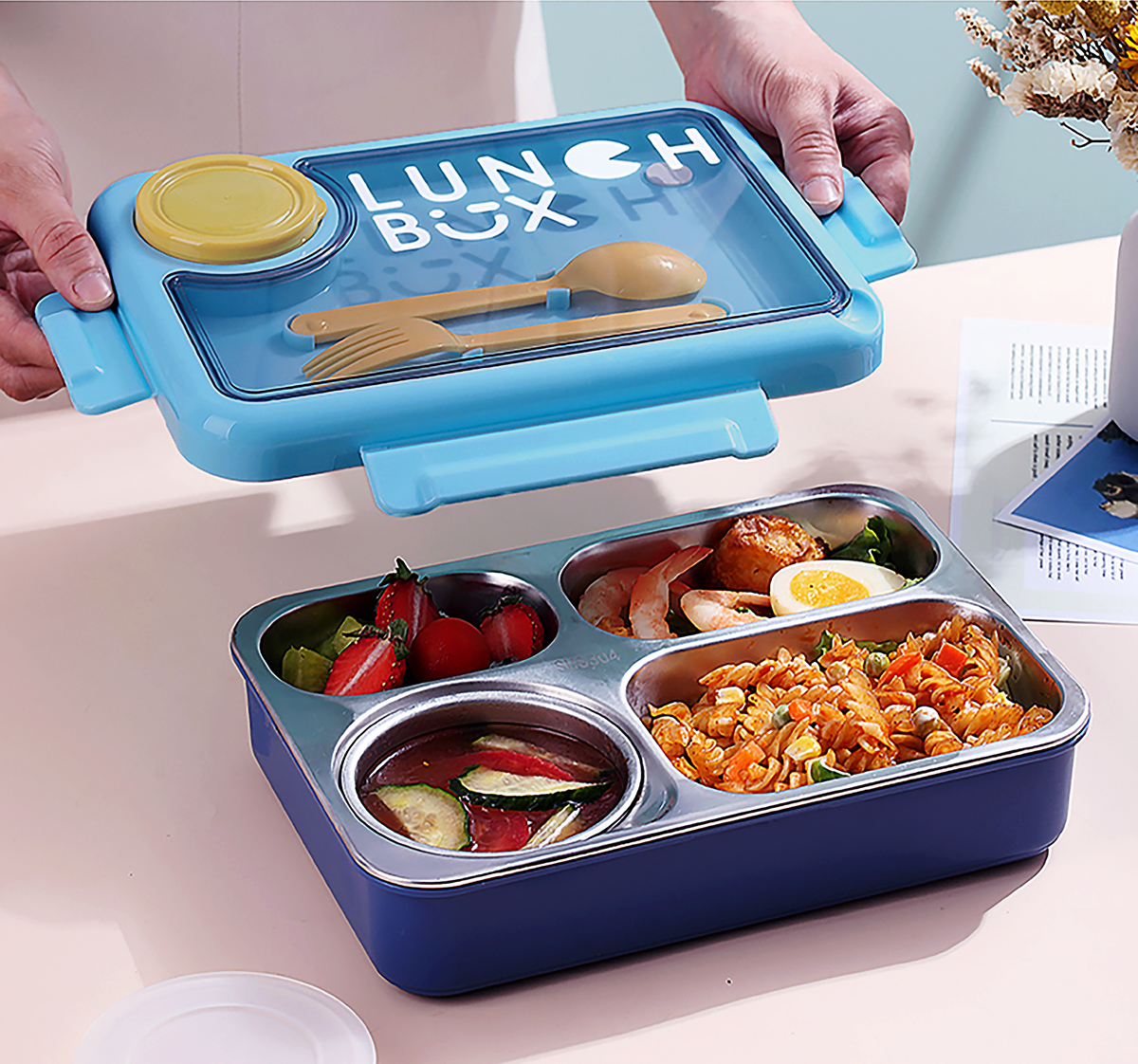 900ml獨(dú)立密封不銹鋼餐盒4格+醬料杯80ml+PP勺叉/帶湯碗150ml