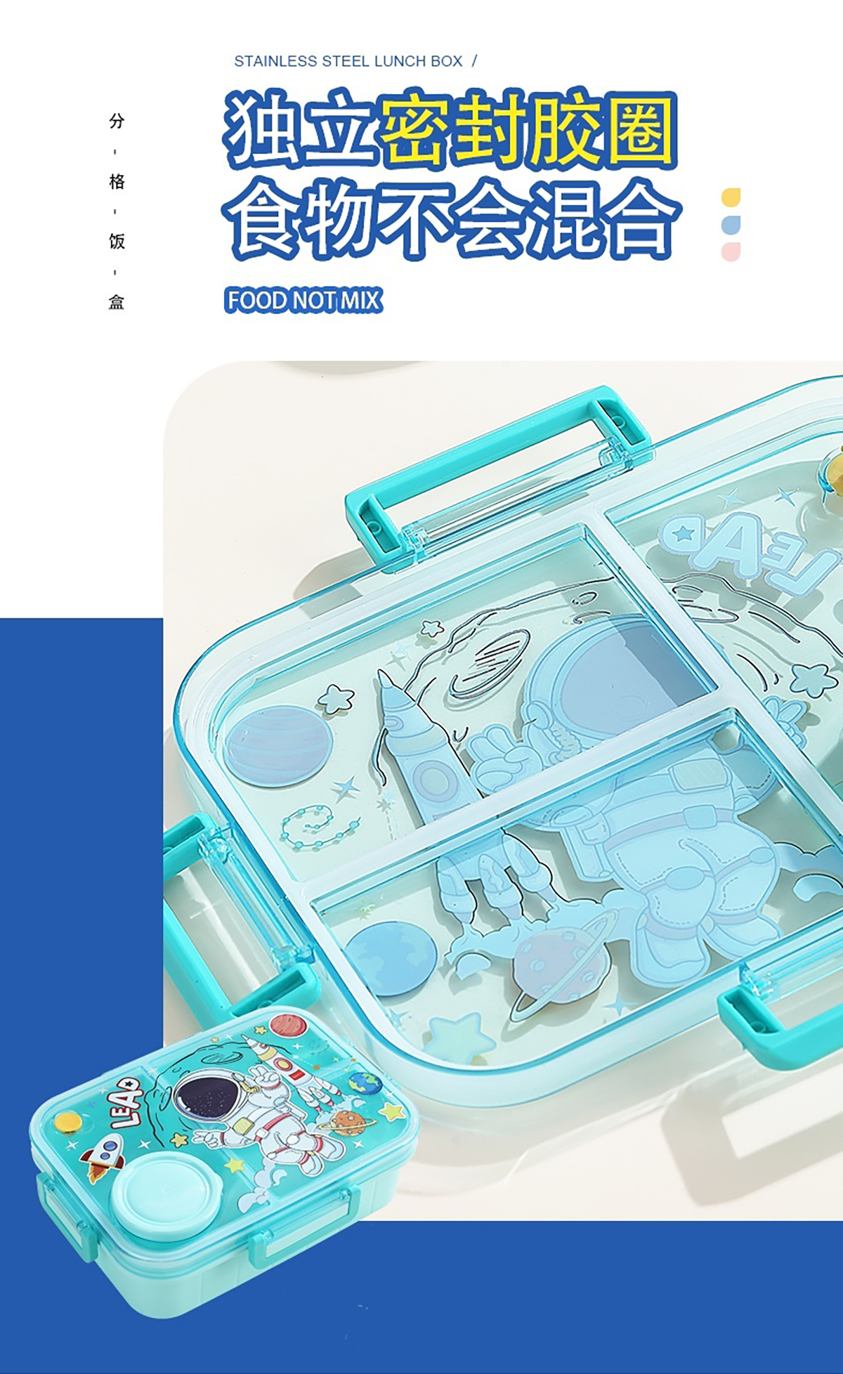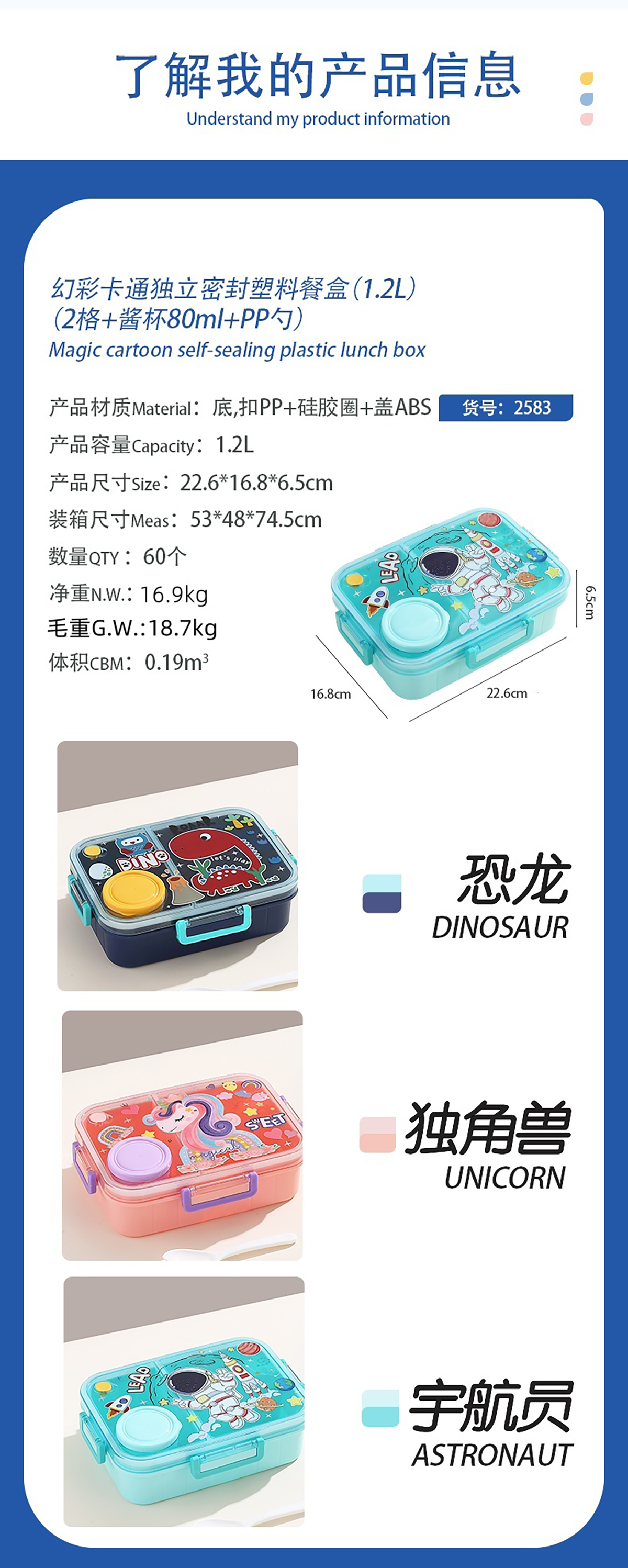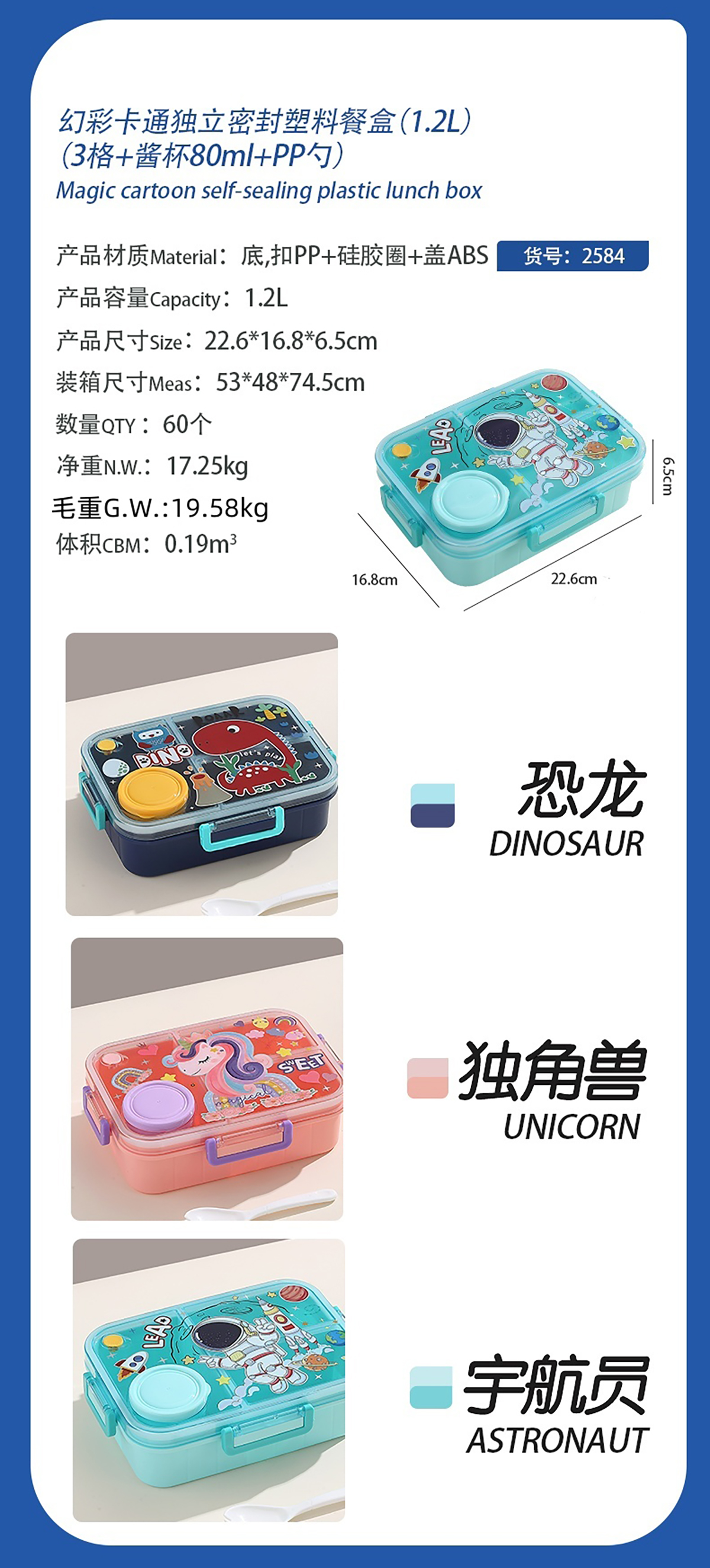 1.2L幻彩卡通獨(dú)立密封塑料餐盒(2格/3格+醬杯80ml+PP勺)