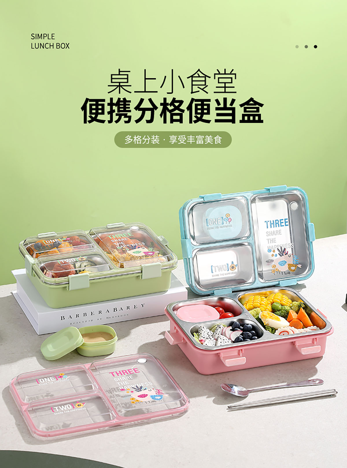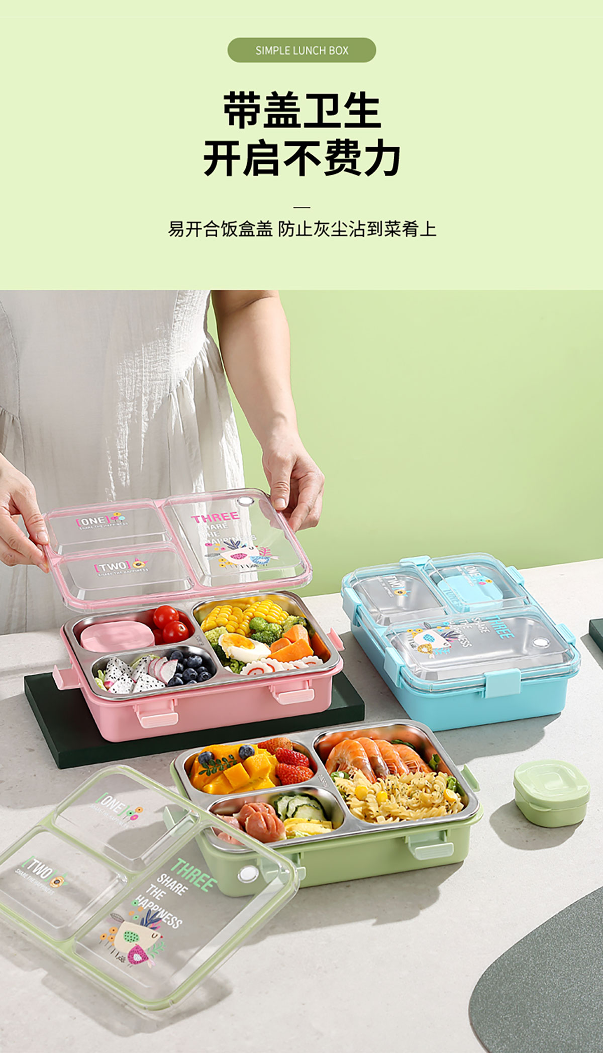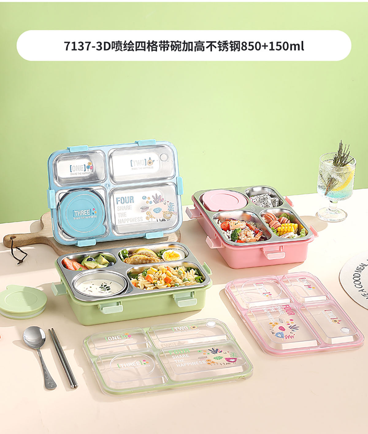 3D噴繪大三格/四格帶醬盒/四格帶碗加高不銹鋼餐盒