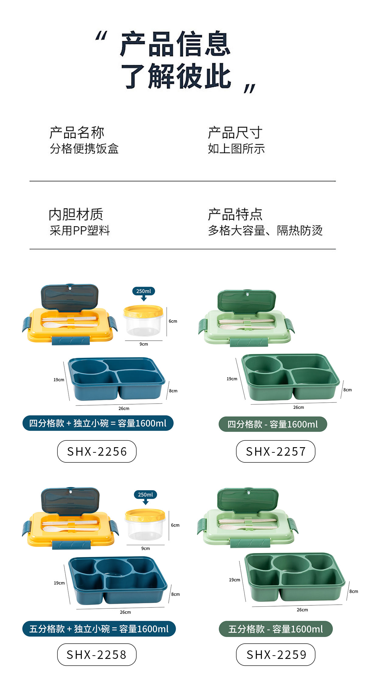 Size: SHX-2256(四格帶湯碗):飯盒:260*190*80mm 湯碗:Φ90*60mm/250ml