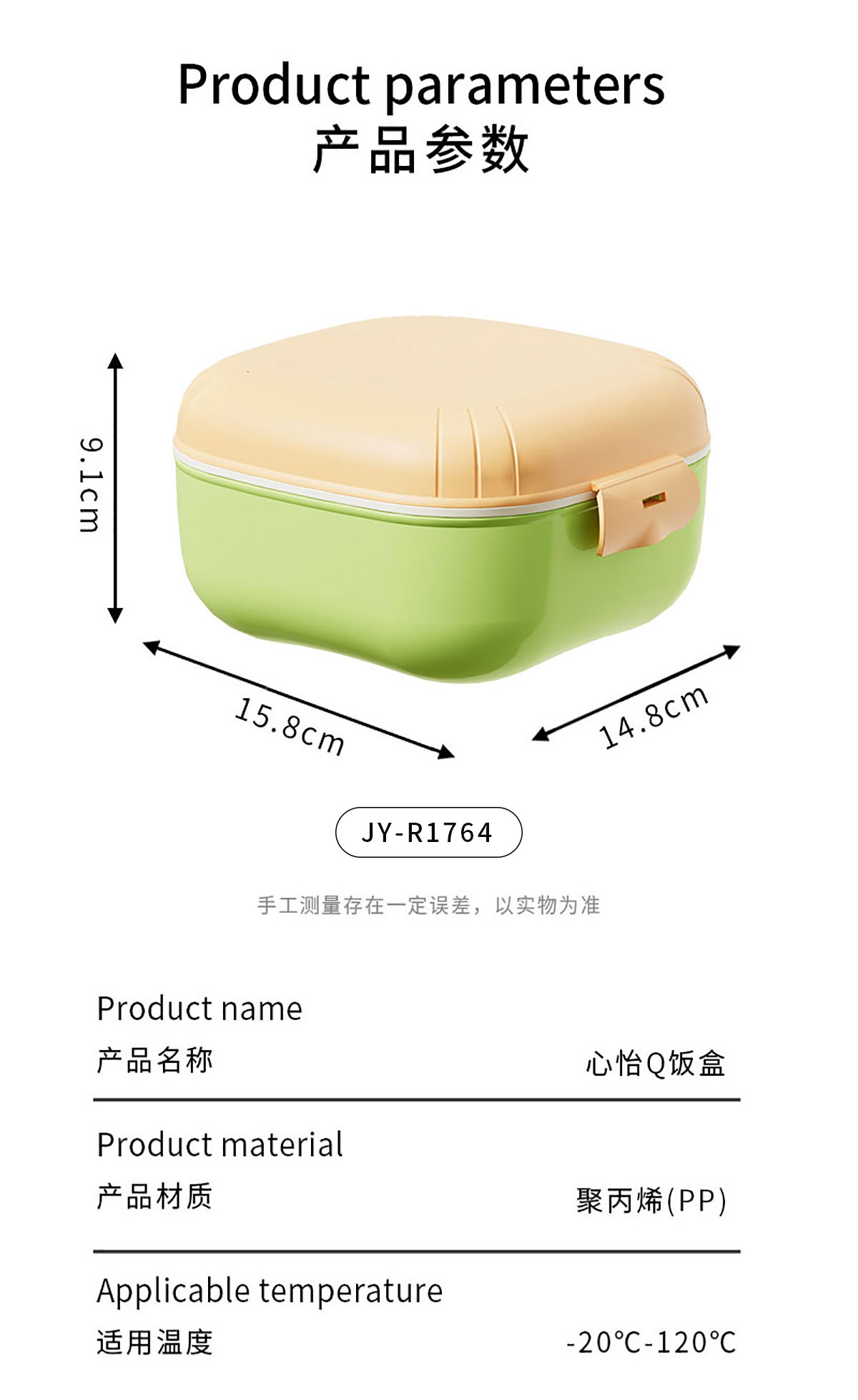 Size: JY-R1764(方形):148*148*90mm JY-R1766(套裝):飯盒:148*148*90mm/750ml 水杯:156*70*70mm/480ml