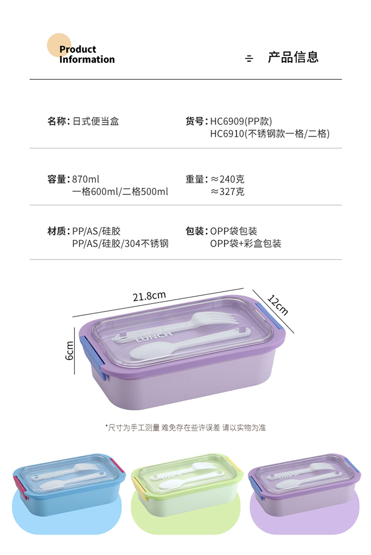 Size: SWY-HC6909(PP款二格):218*120*60mm/870ml