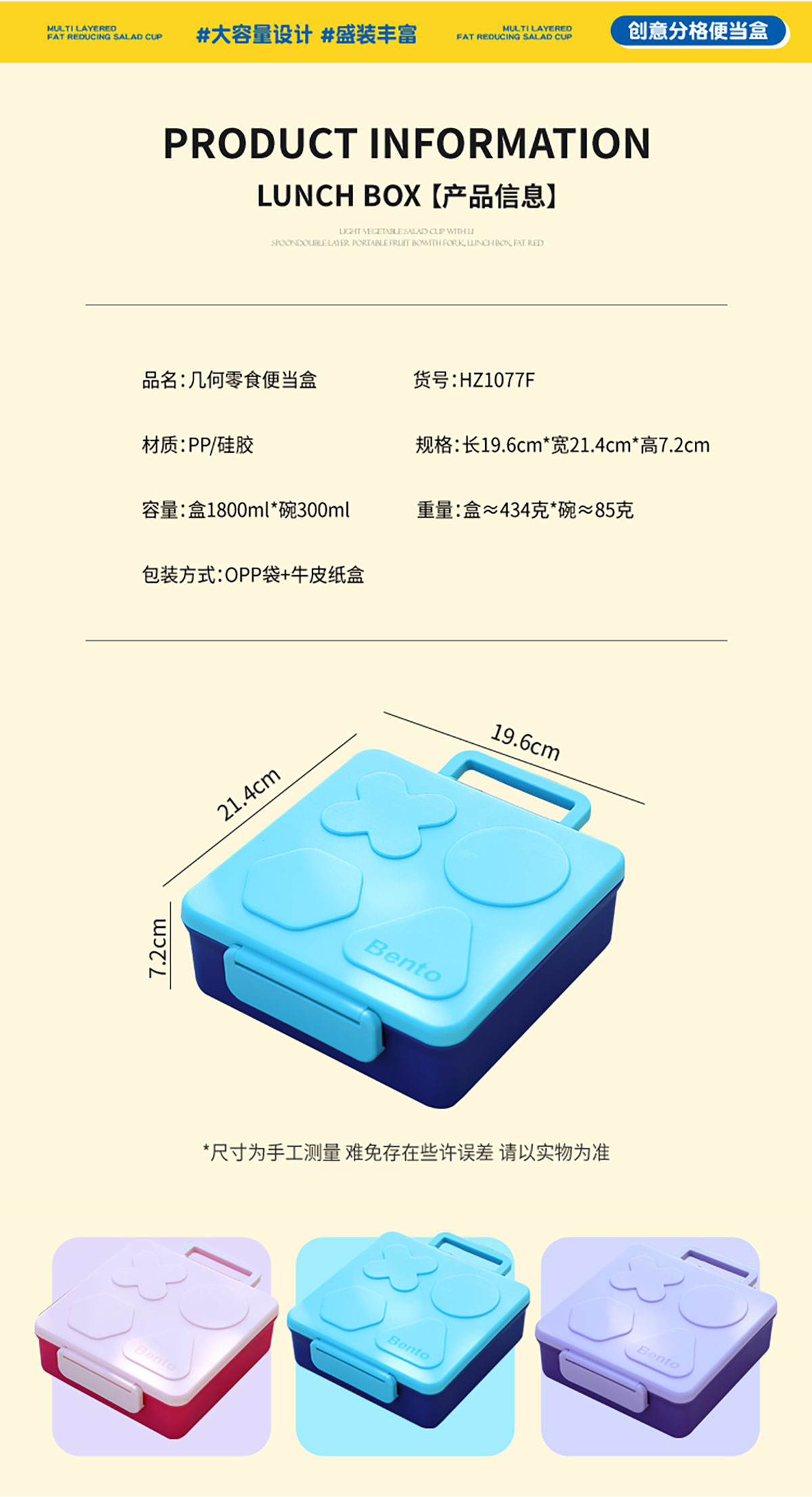 Size: 飯盒:196*214*72mm/1800ml 碗:直徑106*高65mm/300ml